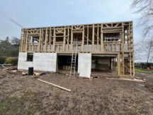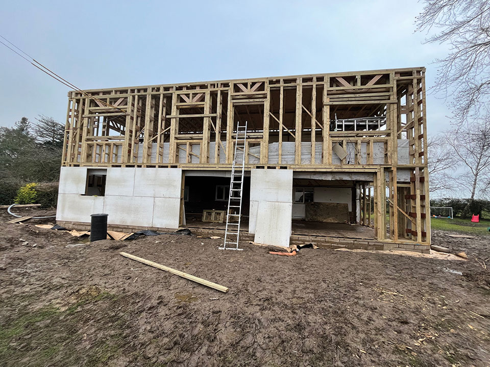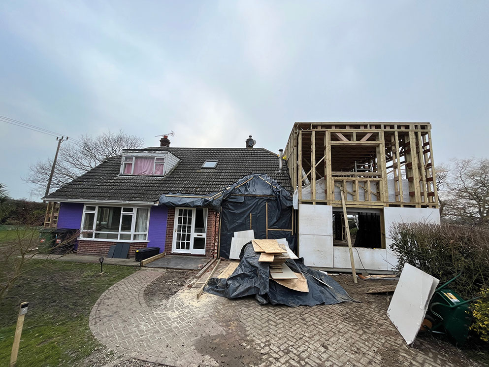 Construction got underway in January 2022 using a clever system that Beattie has developed for this sort of project. In essence, and greatly simplified, it involved constructing a timber shell that surrounds the existing bungalow and also provides the framework for the new first floor and side extension.