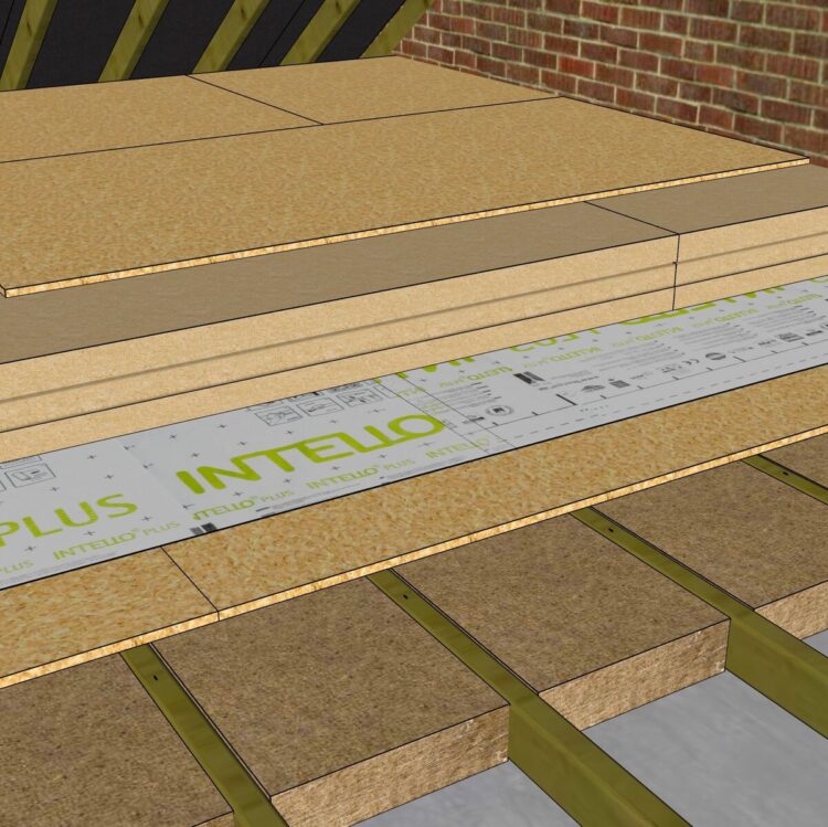 Where the existing ceiling plasterboard cannot be removed then a moisture vapour diffusion variable membrane, such as Pro Clima Dasatop, can be installed from above the ceiling prior to insulating. Pro Clima Dasatop can be installed in a ‘sub and top’ configuration where it is run over the top and down the sides of the ceiling joists and across the cold side of the ceiling plasterboard creating a cradle for the insulation to be installed between the ceiling joists. Due to the moisture vapour diffusion variable properties of the Pro Clima Dasatop membrane then no moisture is trapped at the top of the ceiling joists. Hence the Pro Clima Dasatop provides air tightness at ceiling level and also manages moisture.