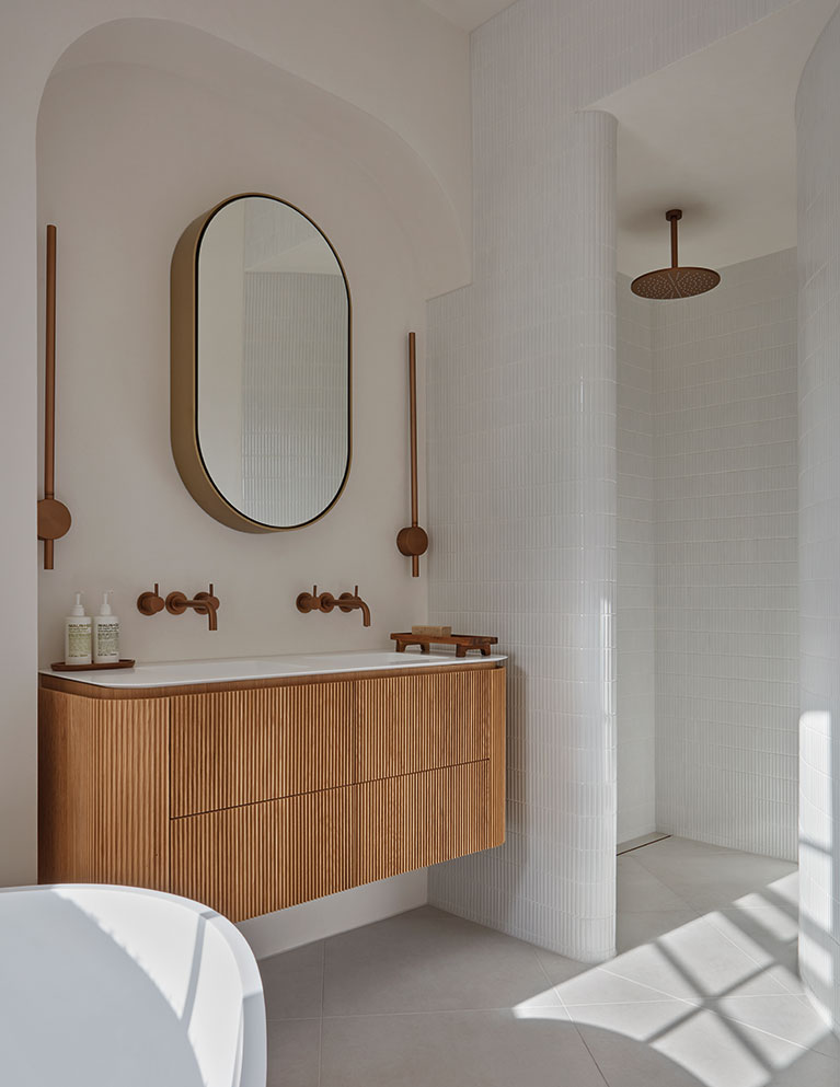 The master bathroom occupies the narrowest point of the property, where its shape has been used to full advantage. White walls contrast with warm oak cabinetry, and a freestanding bath serves as the focal point. “My two requests were for super-power showers and a Japanese toilet,” Andrew explains.