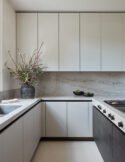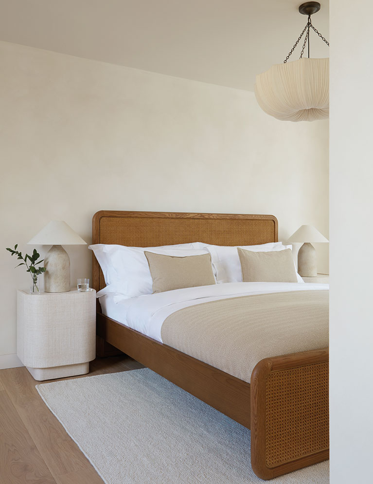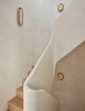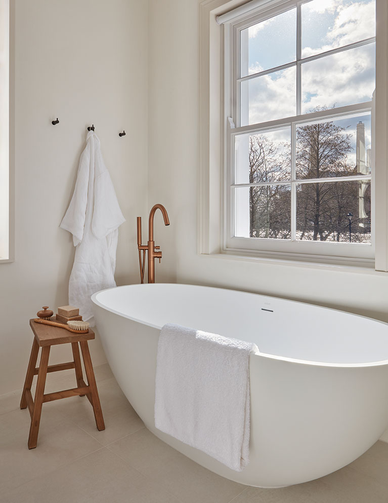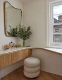 The master suite benefits from bespoke joinery, a dressing room, and dual-aspect windows offering striking contrasts between views of contemporary and historic London. “I grew up looking out at Battersea Power Station, so it’s an important landmark for me,” says Andrew. A built-in dressing table follows the curved theme seen throughout, while carefully chosen furniture maintains the soft, understated aesthetic.