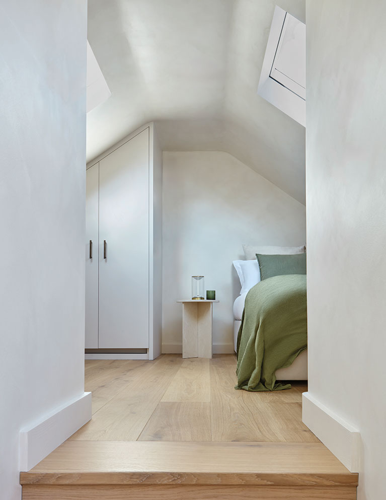 New skylights frame views of the neighbouring chimney tops, and bespoke cabinetry provides storage within the apex-shaped room. On the floor below, their daughter’s bedroom also overlooks Battersea Power Station, now a shopping and leisure destination, and includes a custom-designed desk area.