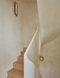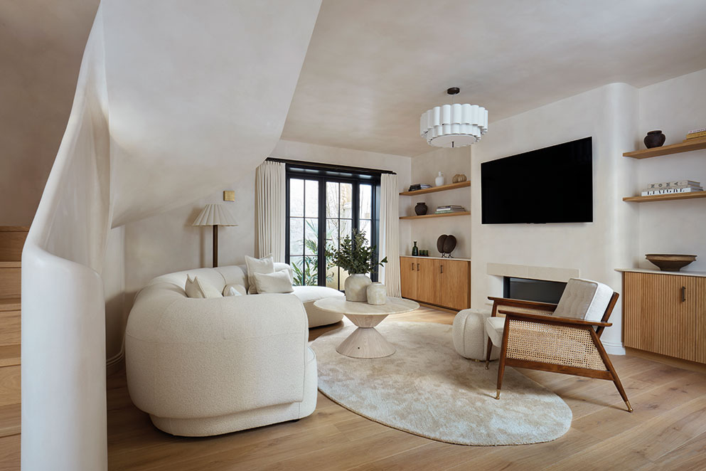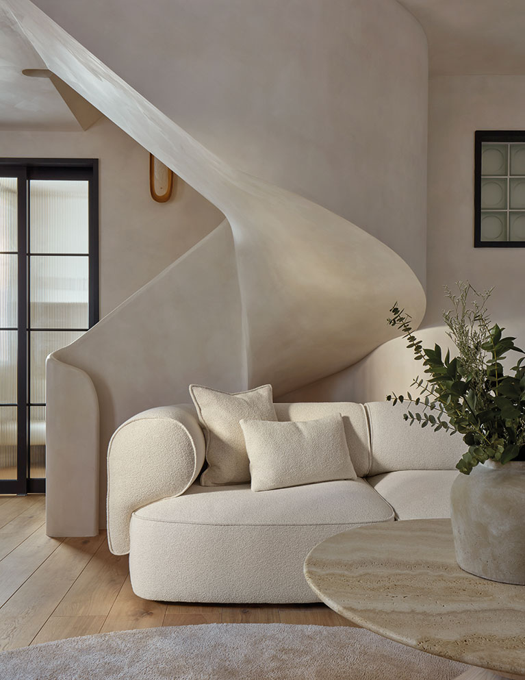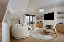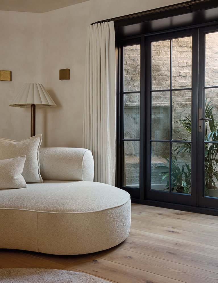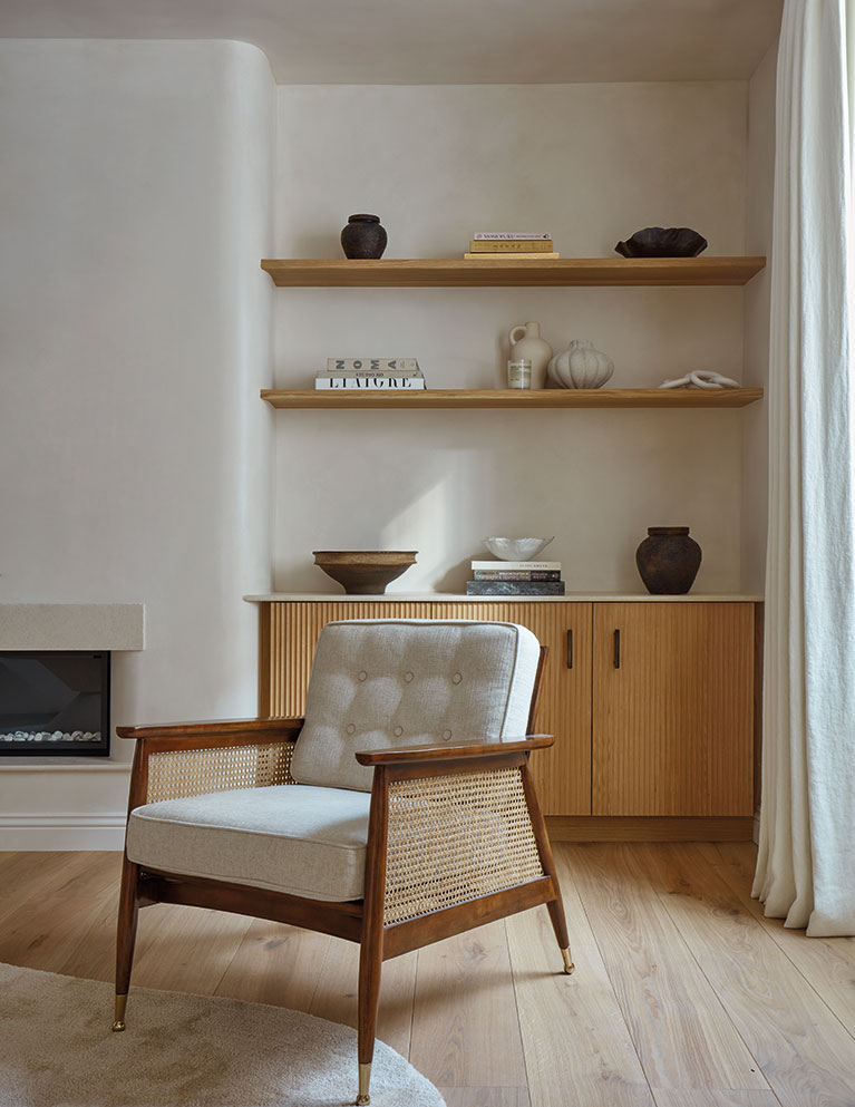 “After living in a flat, it feels strange walking downstairs to the living room,” says Andrew. Light oak flooring and underfloor heating create a warm, inviting atmosphere, and the neutral palette enhances the sculptural quality of the space.