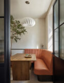 A bespoke leather banquette seating area curves around the table beside the kitchen, echoing the home’s architectural theme. “We came from a small flat with no room for a dining table, so it’s great to be able to sit together now to eat,” says Andrew.