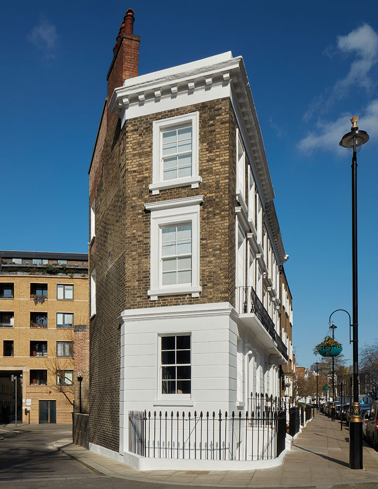 The resulting extreme makeover is testimony to the talents of architecture and design studio Michaelis Boyd and to Nathalie Wong’s minimalist vision. Windows that had once been blocked up to evade the window tax were reinstated and the building’s tapering corner footprint presented a unique opportunity to create unusually shaped bathrooms at the narrow end.