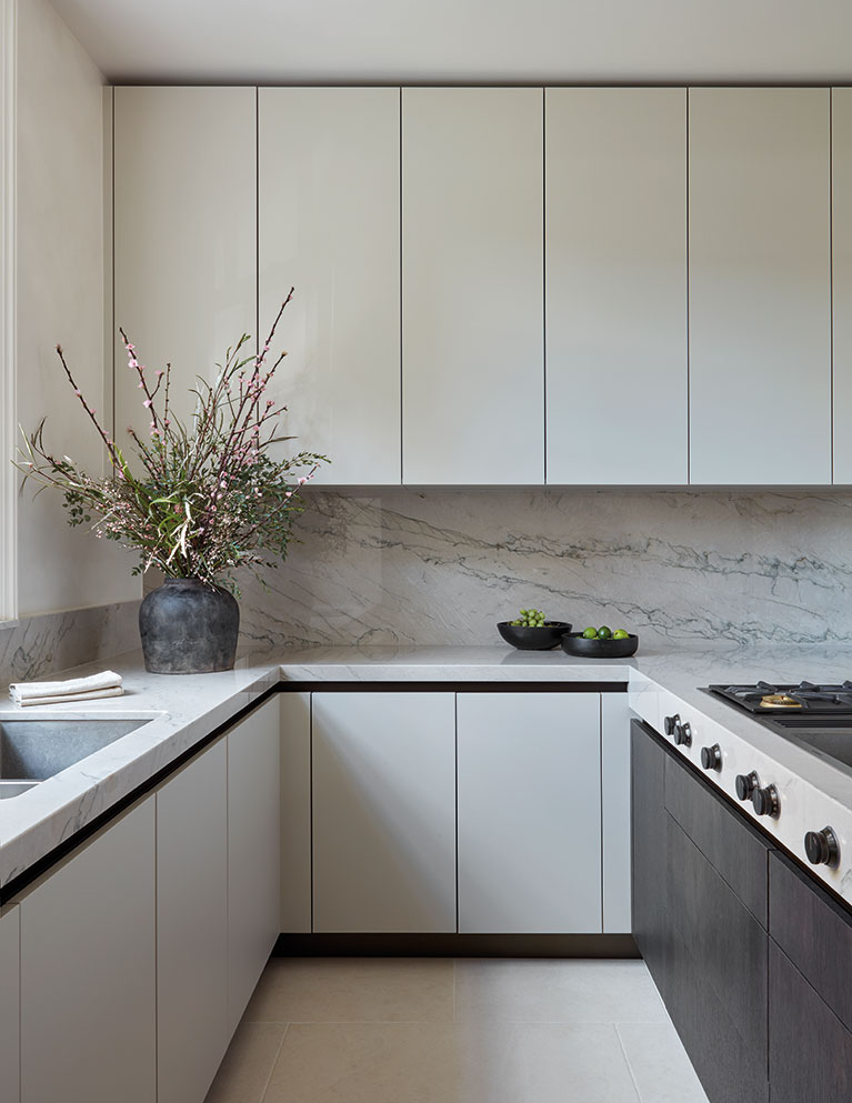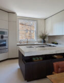 The ground floor kitchen and dining space form the family’s main hub, with dark wood cabinetry, topped with cool-toned marble quartzite counters, creating a sleek and functional setting for both family life and filming cookery videos.