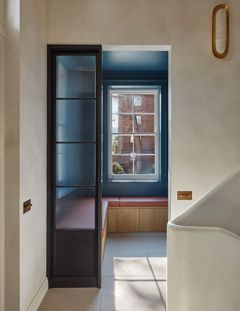 The family sitting room is situated in the basement and opens onto two small courtyard areas, while the original chimney wall now contains a bespoke fireplace and fitted cabinetry, with the dramatic staircase cascading down to create a focal point.