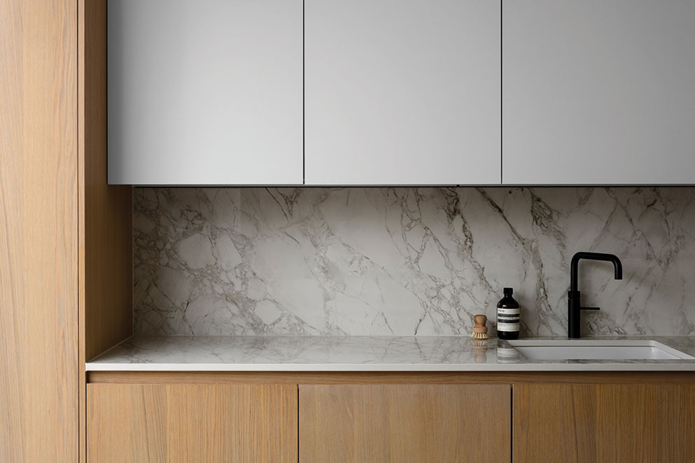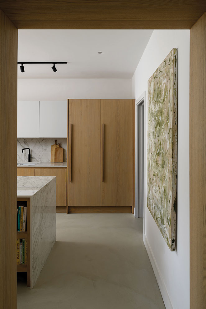 The kitchen, designed in collaboration with Archispek, is a contemporary combination of natural oak, off-white veneer cabinetry and white Calacatta marble. “We changed our minds a few times around the kitchen design and how large the island should be,” Jane recalls. “Wooden floors were a consideration, but then I thought there would be too much wood and Ben suggested micro cement instead.” says Jane. “Everything is very functional but stylish too and there’s so much storage that I haven’t used it all yet!”