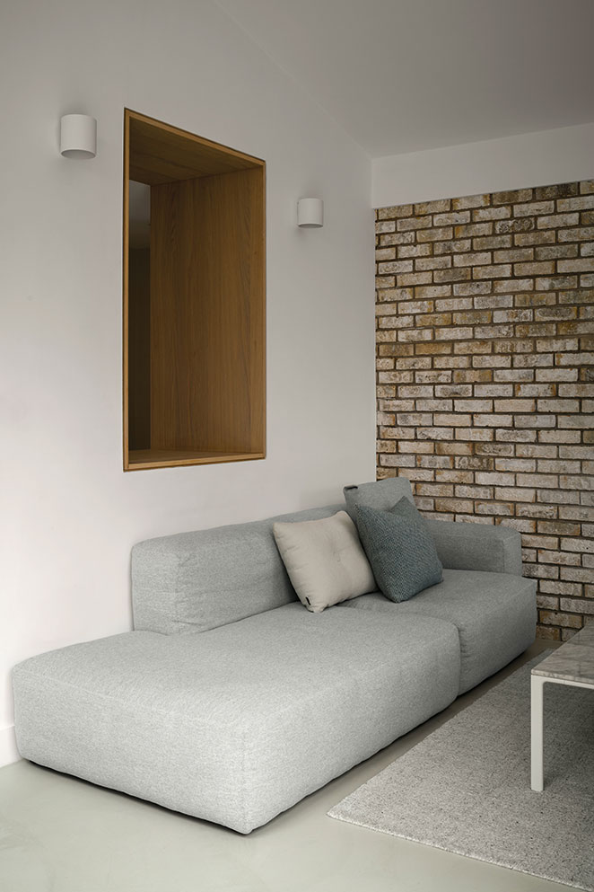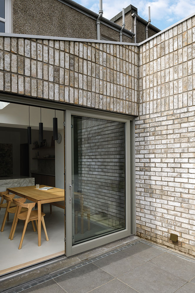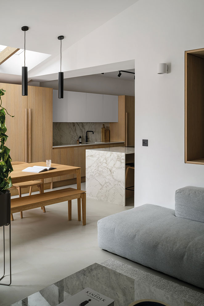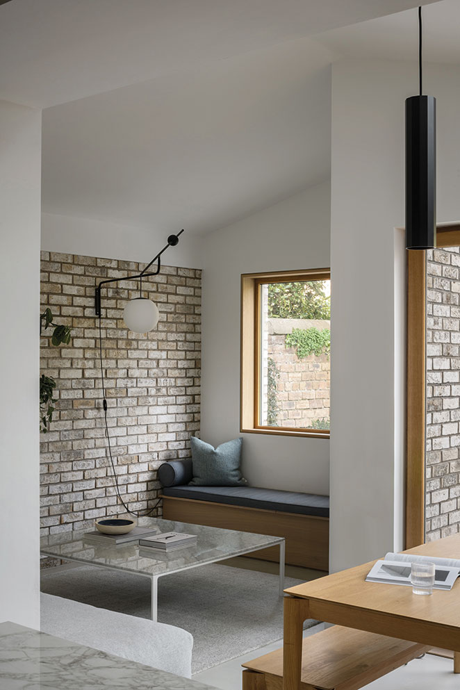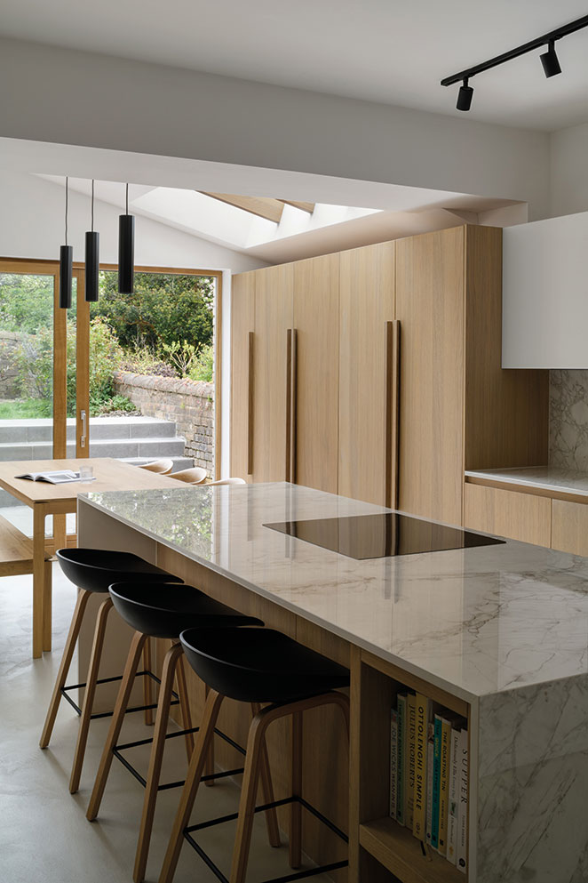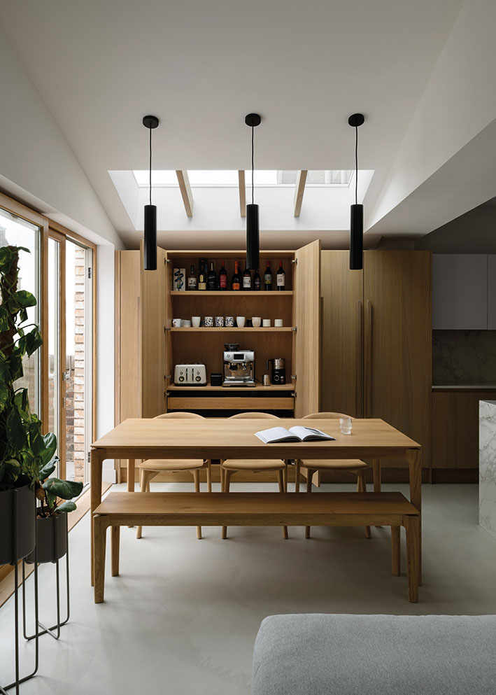 As a result, the inspiration for the materials palette was drawn in the main from the original exterior at the back of the property, as Ben explains: “Sam and Jane showed us some images that they liked and we proposed a material palette based on that. We took inspiration from the brick boundary wall outside and from the back elevation, which was a sandy coloured pebble dash.”