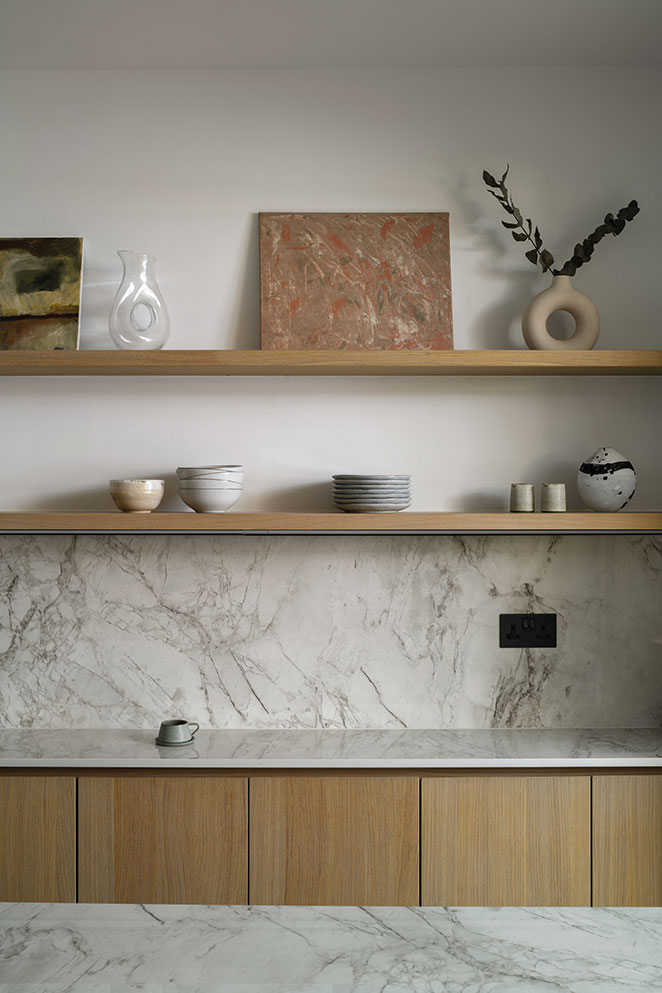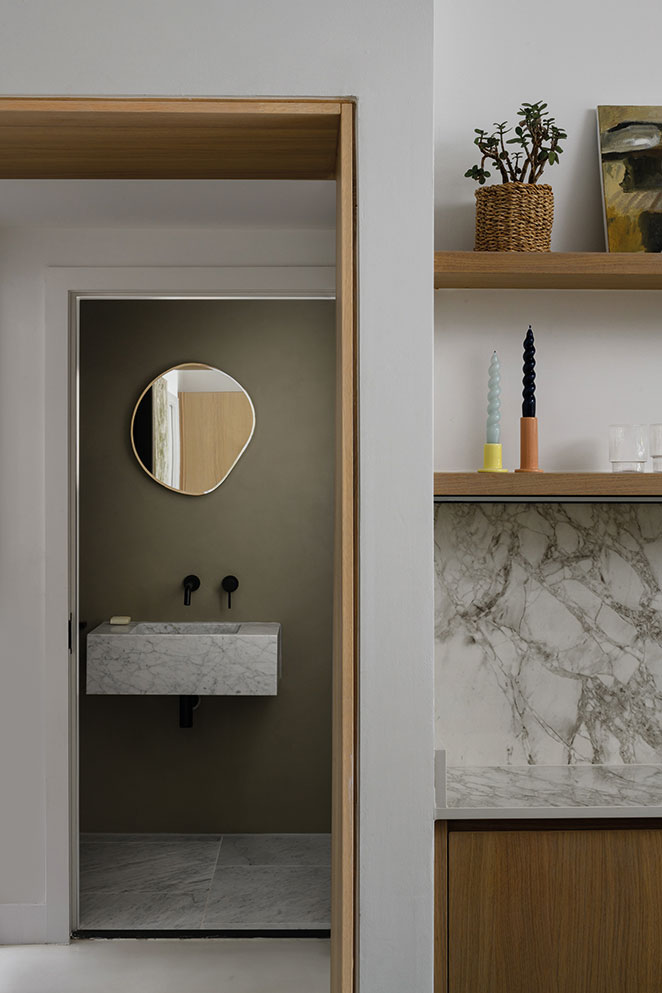 This attention to detail and a quest for continuity and flow were reflected in the choices for the rest of the material palette. With a marble fireplace in the sitting room, echoing this material in the kitchen countertops and island, along with the sanitaryware in the shower room, brings a cohesiveness to the ground floor which was formerly lacking.