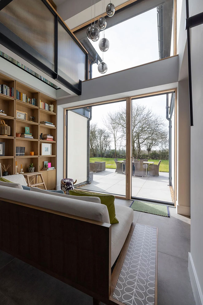 Working with Nicholas Jacob Architects, Fiona’s vision was clear – a timeless, modern home inspired by Scandinavian design. The result is a bright, comfortable space where natural light floods in through expansive glazing. One of the standout features is the double-height library wall, made even more striking by the full-height VELFAC windows that frame garden views and create a real sense of calm.