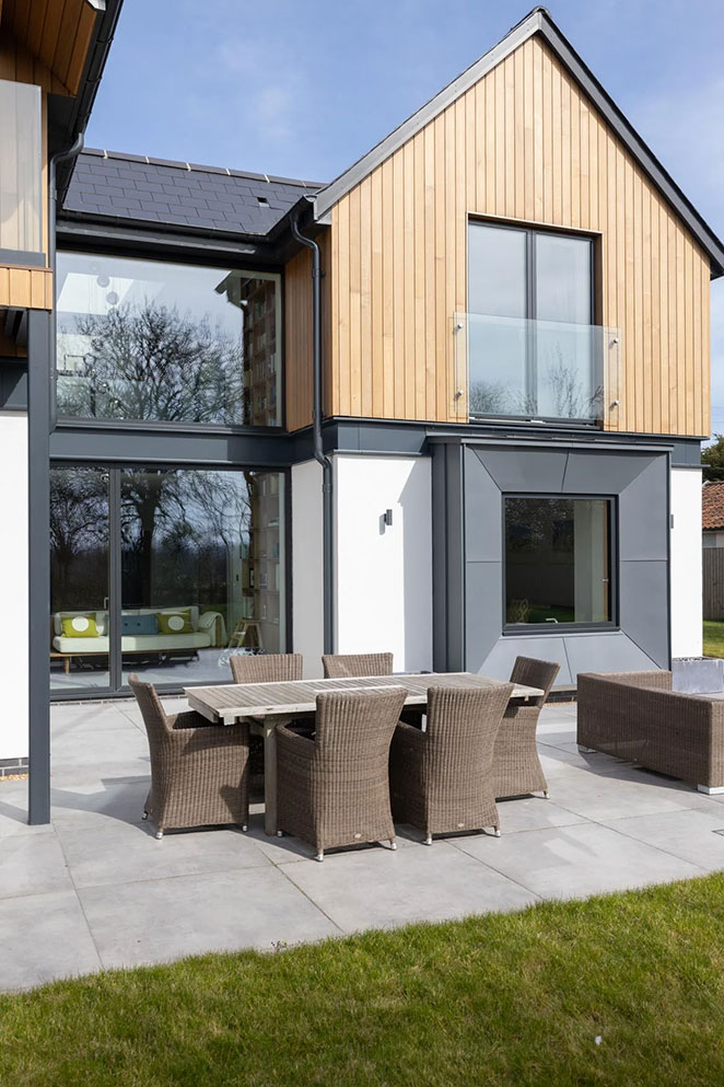 Inside, warm timber frames complement the natural materials used throughout the home, while the exterior’s dark grey aluminium finish ties in beautifully with the zinc detailing.