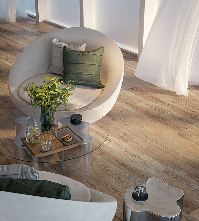 The visual design of every plank is created using patented super-high-definition digital print technology, drawing from an extensive timber library built over three decades by Ted Todd and Woodworks. Each design originates from a real floor, sometimes rare, sometimes historic, sometimes reclaimed from buildings of cultural significance. With no recolours and no repeats across 20 boards, Karta preserves the character of tonal variation, knots, sap lines, medullary rays – everything that makes real wood feel alive.