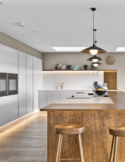 The scheme combines contrasting materials to add depth and texture, with the Travertine & Alabaster Diffuser wall light from Industville bringing a soft, warm glow and natural tactility, complemented by mixed metals such as the splashback, which create a strong architectural contrast.