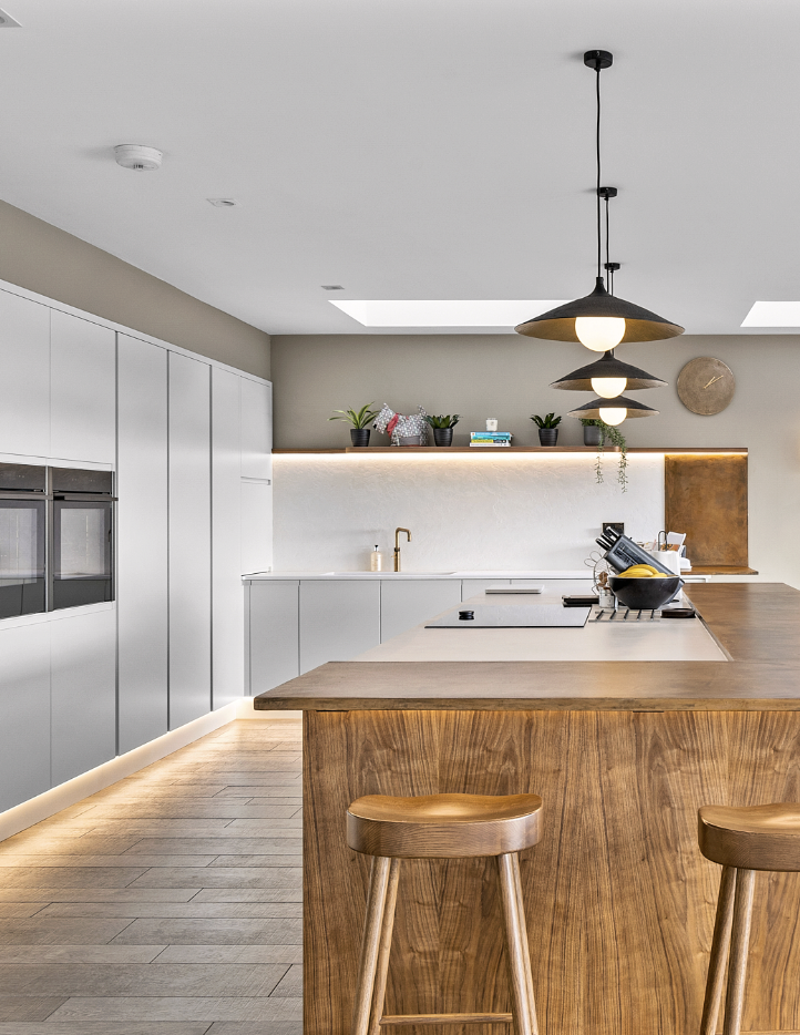 A consistent palette runs throughout, with tones in the lighting complemented by the microcement fireplace, creating a rich, textural finish with warm metallic undertones. Microcement was also used on the worktops and key feature areas, emphasising a cohesive, seamless feel across the design.
