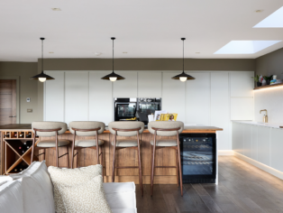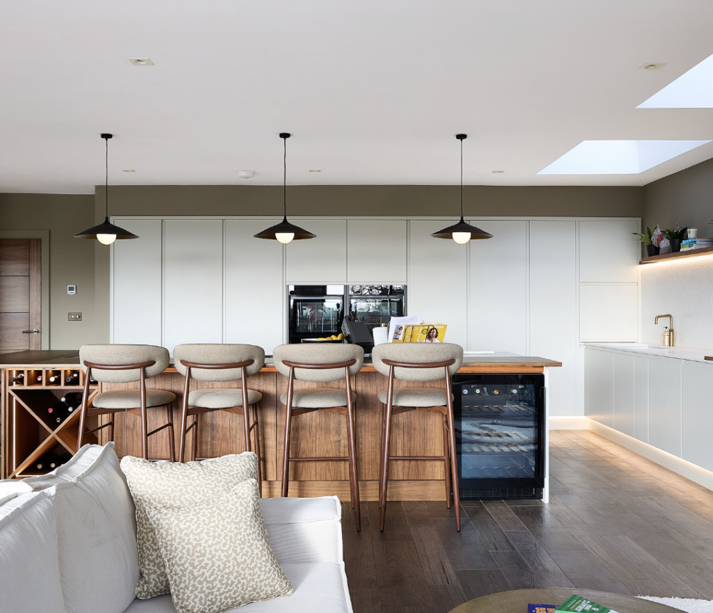 Originally, the island formed part of a full wall-mounted bar but was reworked into a standalone feature. Although this required breaking into the solid concrete floor to run pipework, the result was well worth it, creating a strong focal point within the space. Above it, a trio of Industville Flume pendants in shimmering brass and black introduce handcrafted detailing, with the warm brass finish adding a soft glow and the black tones echoing elements such as the Crittall doors, helping to tie the scheme together.