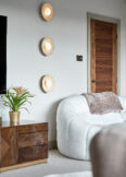 Working with a dynamic couple in their early fifties, Demi was inspired by the home’s expansive open- plan layout. Drawing from the space, light and proportions, she developed a chic Spanish villa concept, introducing Crittall-style doors to subtly divide the interior while maintaining flow. A warm palette of creams, coffee tones and rich browns, layered with natural materials and texture, brings a relaxed elegance to the transformed space.